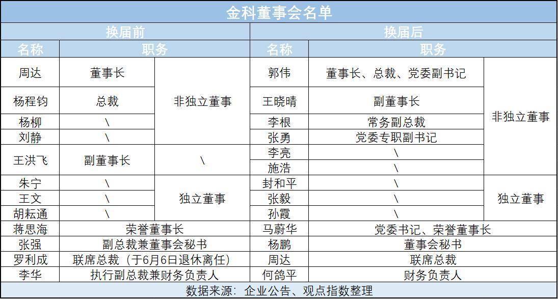 当天晚上,该公司一次性发布了8条公告,大部分都跟董事会有关,当中正式披露了新一届领导班子名单,包括郭伟获任金科股份董事长、总裁、党委副书记,王晓晴任副董事长,周达为联席总裁,李根为常务副总裁,张勇为党委专职副书记,杨鹏为董事会秘书,何鸽平为财务负责人。