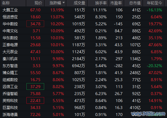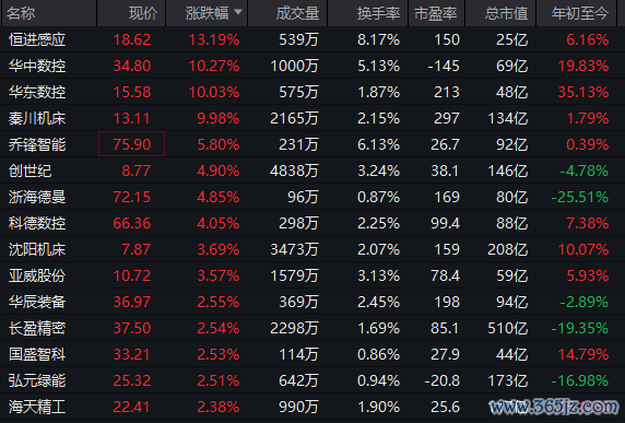 工业母机概念股表现活跃,华东数控、秦川机床涨停,恒进感应、华中数控、乔锋智能涨幅居前。
