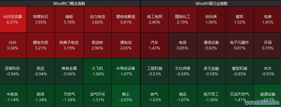 从板块来看,光伏产业链集体走高,储能、通信设备、工业母机等板块涨幅居前;而能源设备、油气开采、海运等板块震荡下挫。
